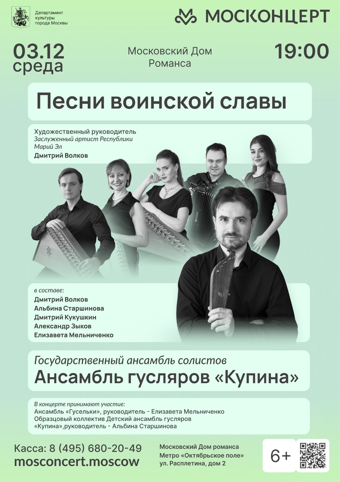 Ансамбль гусляров «Купина» приглашает на программу «Песни воинской славы», собравшую в единый историко-концертный проект казачьи песни и баллады, образцы советской массовой песни и лучшую отечественную эстрадную лирику. Уникальность всей этой подборке придает участие группы гусель – ансамбля инструментов, которые в виртуозной подаче Ансамбля «Купина» не только символизируют связь старины с современностью, но и создают оригинальнейшие эффекты, ценимые как знатоками «русского аутентизма», так и широкой публикой.